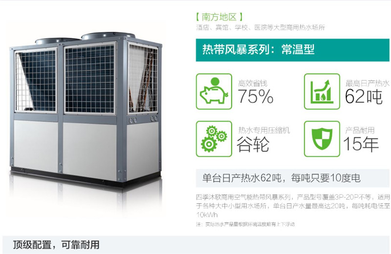 四季沐歌商用空氣能熱帶風暴低溫型系列,產品型號覆蓋15P-30P不等,最低運行溫度達-15℃,單臺日產水量最高達62噸,每噸耗電低至10kWh