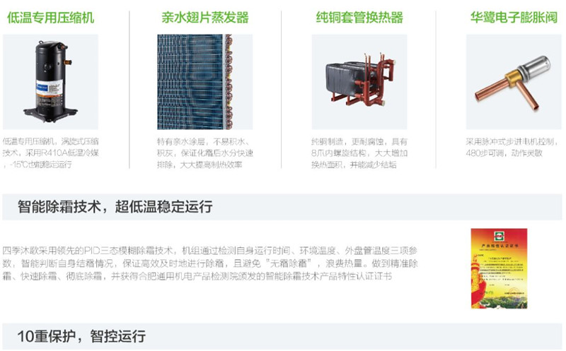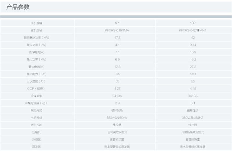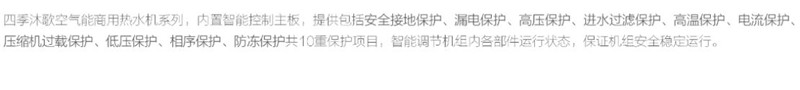 四季沐歌商用空氣能熱帶風暴低溫型系列,產品型號覆蓋5P-10P不等,最低運行溫度達-15℃,適用于長江流域各種大中小型用水場所,單臺日產水量最高達9噸,每噸耗電低至10kWh